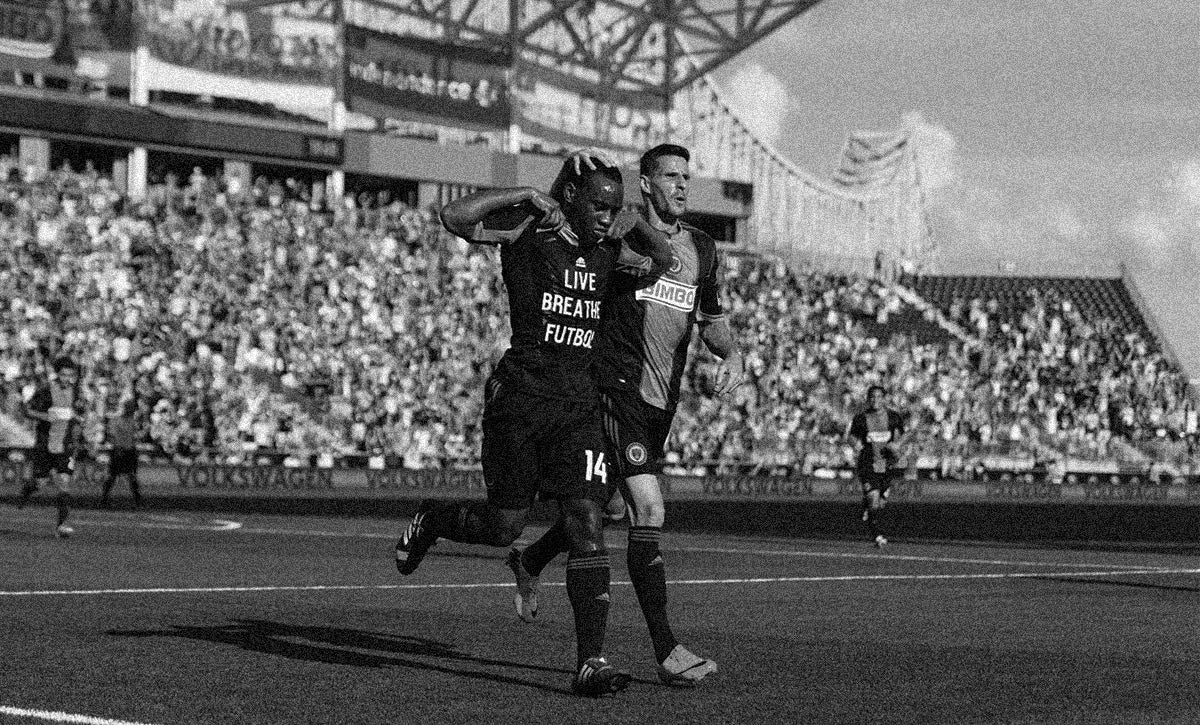 Amobi Okugo reveals an LBF shirt after scoring a header against FC Dallas back in 2013.